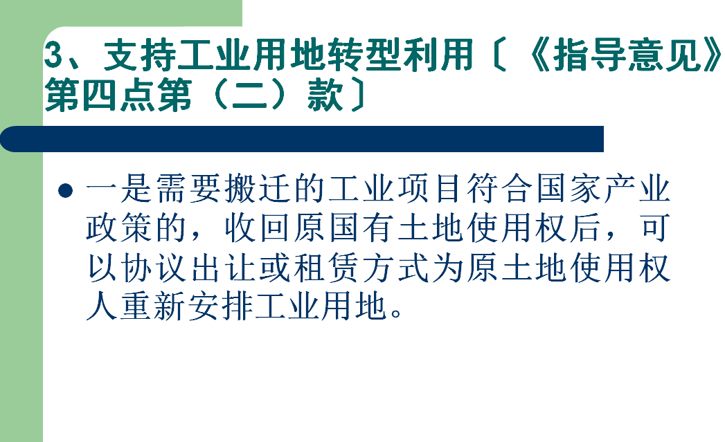 (一)加大低效闲置工业用地盘活力度。各地要对低效闲置工业用地进行全面清理,并制定盘活利用方案,采取切实有效的措施促进高效开发利用。鼓励对边角地、夹心地等分散低效的工业用地整合利用。政府实施城乡规划进行旧城区改建,需要搬迁的工业项目符合国家产业政策的,经市、县国土资源主管部门审核并报同级人民政府批准,收回原国有土地使用权,以协议出让或租赁方式为原土地使用权人重新安排工业用地。拟安置的工业项目用地应符合土地利用总体规划布局和城乡规划功能分区要求,尽可能在确定的工业集中区安排工业用地。