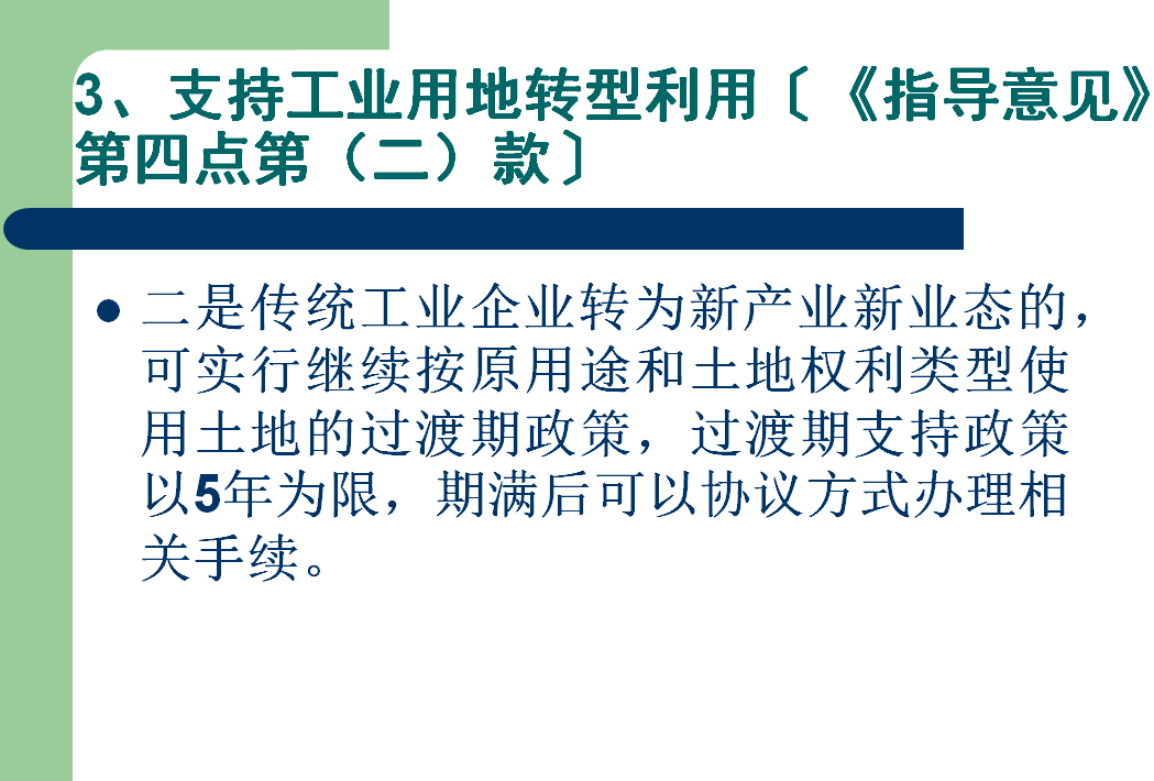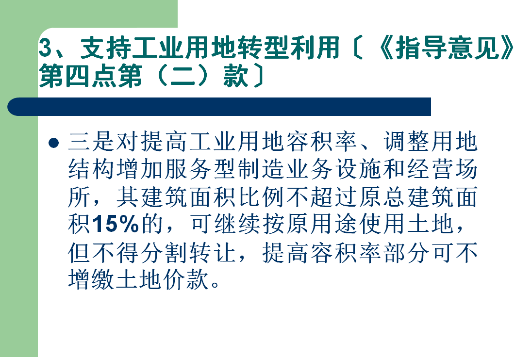 (二)鼓励工业用地原址升级改造。传统工业企业转为先进制造业企业,以及利用存量房产进行制造业与文化创意、科技服务业融合发展的,可实行继续按原用途和土地权利类型使用土地的过渡期政策。过渡期支持政策以5年为限,5年期满及涉及转让需办理相关用地手续的,可按新用途、新权利类型及市场价,以协议方式办理。在符合控制性详细规划的前提下,现有制造业企业通过提高工业用地容积率、调整用地结构增加服务型制造业务设施和经营场所,其建筑面积比例不超过原总建筑面积15%的,可继续按原用途使用土地,但不得分割转让。对现有工业项目不改变用途前提下提高容积率和新建工业项目建筑容积率超过国家、省、市规定容积率部分的,不再增收土地价款。