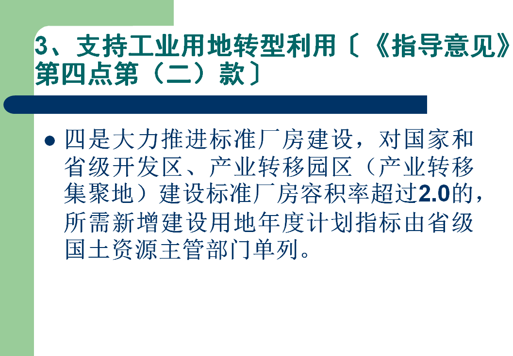(三)鼓励标准厂房及科技企业孵化器建设。加强标准厂房建设的土地供应,国家级和省级开发区、产业转移园区(产业转移集聚地)建设的标准厂房,经园区所在地的地级以上市政府确认其容积率超过2.0并由土地使用者提出申请后,所使用的用地计划指标可由省级国土资源主管部门予以返还。对于利用新增工业用地开发建设的科技企业孵化器,可按一类工业用地性质供应土地,在不改变其服务用途的前提下,其载体房屋可按幢、层等不动产单元进行产权登记并出租或转让。