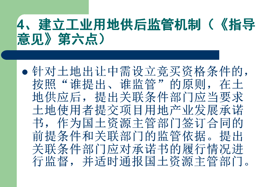 (一)建立部门共同监管机制。各地要进一步建立完善土地管理共同责任机制。对需享受政策的市场主体,投资或相关行业主管部门应向国土资源主管部门提供项目符合条件证明文件,国土资源主管部门登记备案后执行。对于有关部门提出规划条件、建设标准、非生产设施占地比例、产业类型、投资强度、产出效率和节能、环保等作为土地使用条件的,应按照“谁提出、谁监管”的原则,在土地供应成交后,提出关联条件部门应当要求土地使用者提交项目用地产业发展承诺书,作为国土资源主管部门签订合同的前提条件和关联部门的监管依据。提出关联条件部门应对承诺书的履行情况进行监督,并适时通报国土资源主管部门。项目用地达不到约定要求的,各相关部门应按职能分工依法依约进行处置。对不符合享受政策的,要及时终止政策执行。