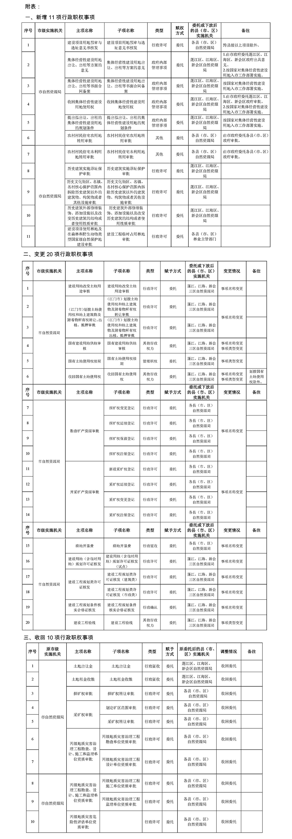 为深化“放管服”改革,按照《江门市人民政府关于调整一批市级行政职权事项的决定 》(江府〔2023〕26号),我局调整市级行政职权事项共31项,赋权方式均为委托县级(市、区)自然资源部门或林业主管部门实施,其中:新增委托事项11项,变更事项20项,收回委托10项。本次调整的仍保留或变更事项,原受托机关不变,并继续实施。新增委托事项,自2024年1月26日起,我局原则上不再受理,由受托机关实施。具体调整事项详见附表。