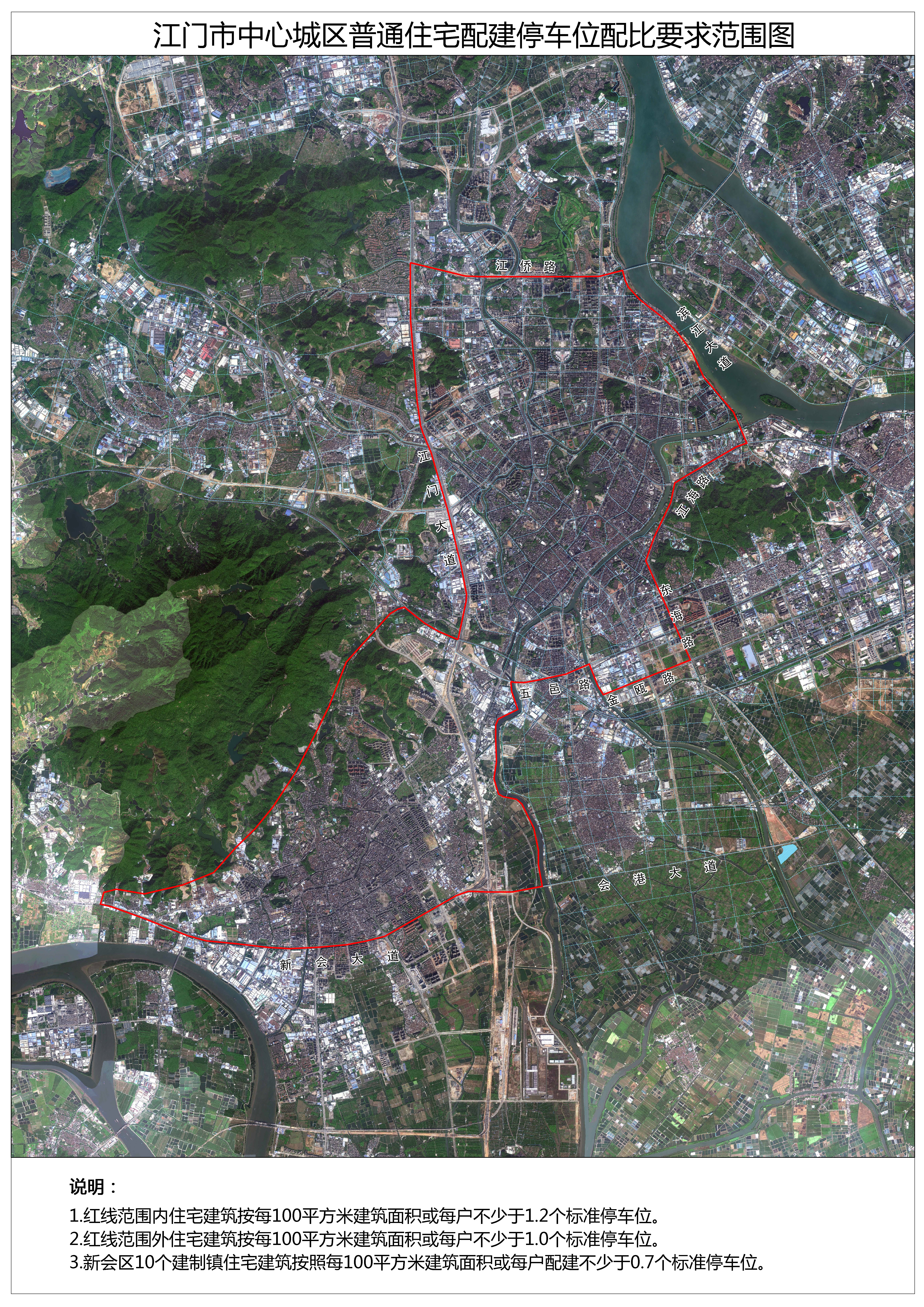 (八)江侨路、西江、江海路、东海路、金瓯路、睦州水道、五邑路、江门大道围合范围,以及新会区会城街道新会大道以北范围,住宅建筑按每100 平方米建筑面积或每户配建不少于1.2个标准停车位(详见附图);中心城区除上述范围以外的其他区域,住宅建筑100 平方米建筑面积或每户配建不少于1 个标准停车位;新会区10 个镇辖区,按照每100 平方米建筑面积或每户配建不少于0.7 个标准停车位。