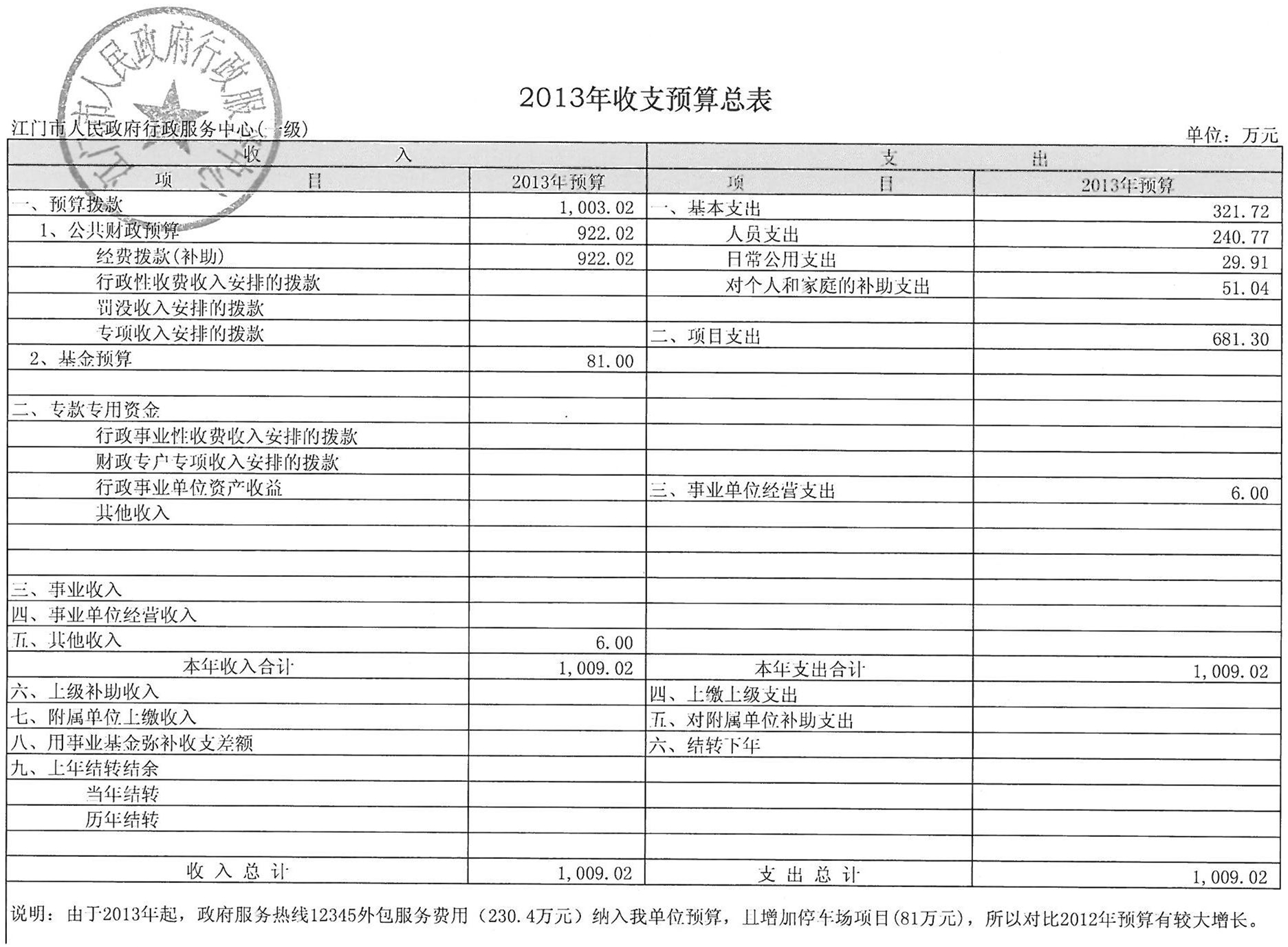 江门市行政服务中心2013年收支预算总表