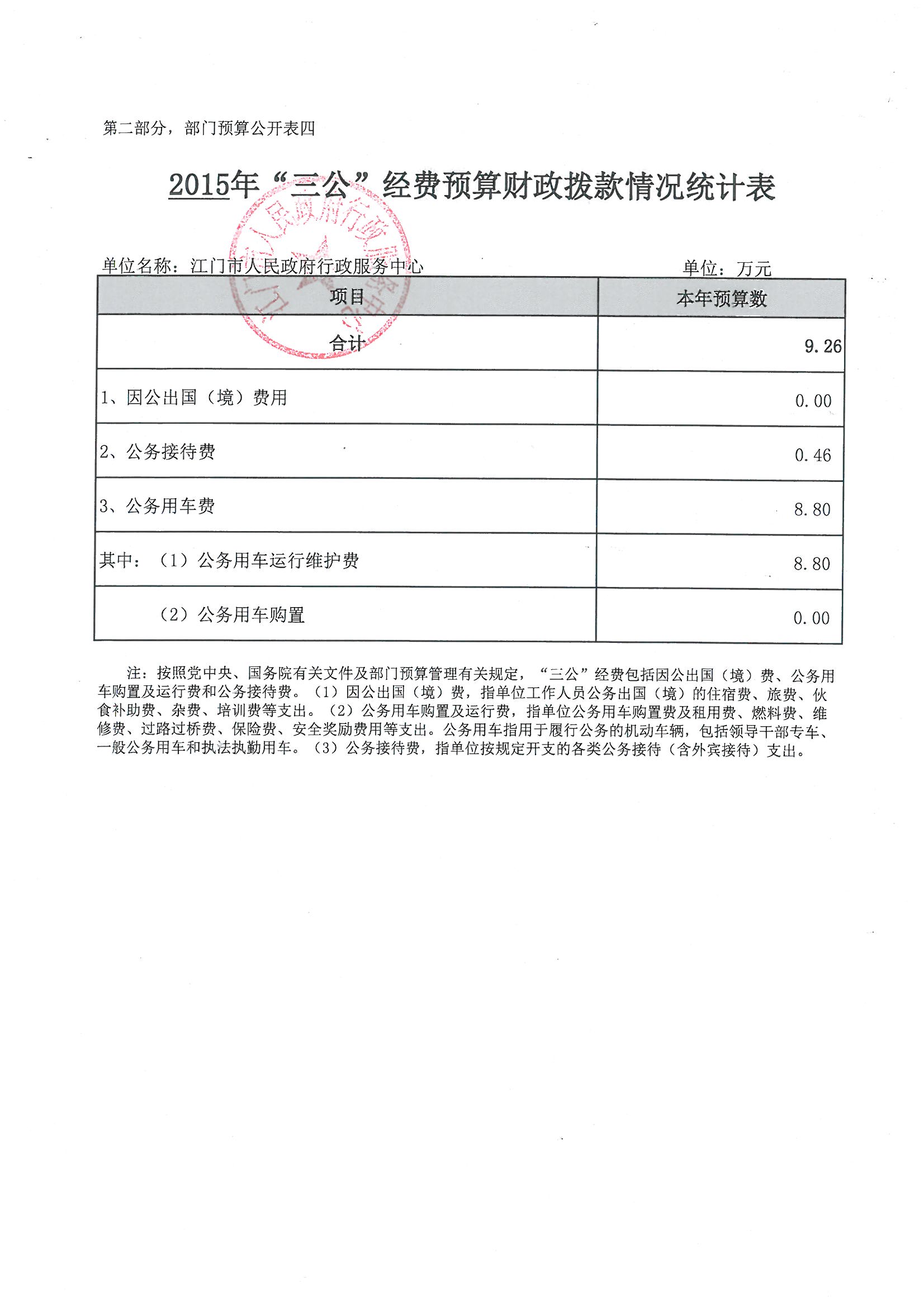 2015年江门市人民政府行政服务中心用财政拨款数开支的出国(境)经费、车辆购置及运行费、公务接待费(简称“三公”经费)支出合计9.26万元。