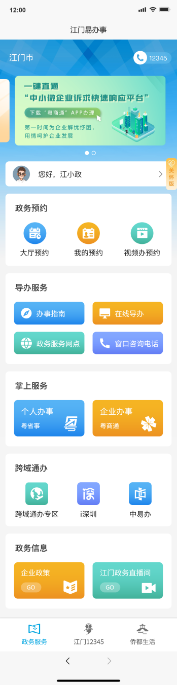 江门12345板块——移动享通过“江门12345”板块,提供多种沟通交流的互动渠道,您可以“在线咨询”“投诉建议”,也可一键直通“中小微企业诉求快速响应平台”,民声民意一键传递!如果您有市场准入、营商环境、消费维权等方面的诉求和建议,在这里,您想说的话我都认真听。