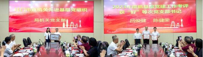 会议在雄壮的国歌声中开始,在宣读有关表彰决定后,局领导为老党员欧湛光颁发了“光荣在党50年”纪念章,向获得江门市“两优一先”表彰的优秀党务工作者吕俊健、获得市直机关工委先进基层党组织——机关党组织表示祝贺,并为获得江门市美高梅博彩和数据管理局表彰的优秀党支部书记、优秀共产党员颁发了荣誉证书。