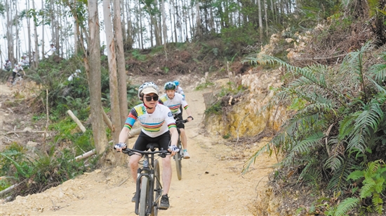 自行车爱好者在恩平泉林黄金小镇体验山地自行车赛道。