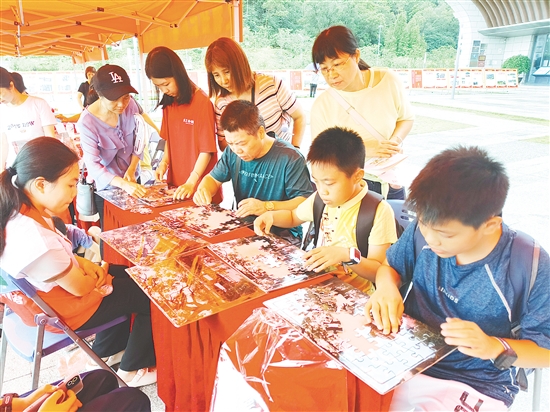 在文物拼图大挑战区域,银发老人戴着老花镜,指尖小心翼翼地挪动拼图;结伴而来的大学生围坐在一起,一边热烈讨论拼图策略,一边分享对恩平历史的见解;孩子攥着拼图,时而歪头思索,时而与家长热烈讨论,家长则耐心引导。当一块块以“三驳桥”“石山摩崖石刻”“恩平市博物馆新馆主体建筑”为原型的拼图逐渐完整,现场欢呼声此起彼伏。大家带着满满的成就感,有序排队加盖特色印章,在方寸拼图间,完成一场跨越时空的文化对话。