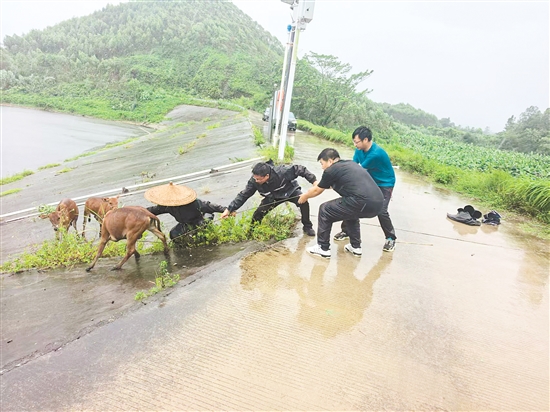 “一二三、一二三!大风快来了,大家一起用力,把阿伯的牛拉上来!”7月20日中午,大牛山水库堤坝边风雨交加,东成镇党员干部在巡查时,发现8头散养家牛因受惊失控被困,农户多次尝试牵引未能成功。党员干部当机立断,迅速组织展开救援,成功将牛群转移至安全区域,为农户挽回经济损失。