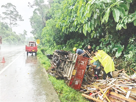 江门市恩平公路事务中心公路巡查工作人员帮助受台风影响导致三轮车侧翻的群众。