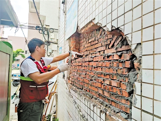 江门日报讯 (文/图 记者/何榕 通讯员/林敏如) “一直困扰着我们的‘破墙洞’,现在终于修好了,房屋也变得更加安全和美观了,实在是太高兴了!”昨日(6月13日),外海街道永康社区高新小区居民李彪欣喜地发现,小区内的“破洞墙”被修补好了。