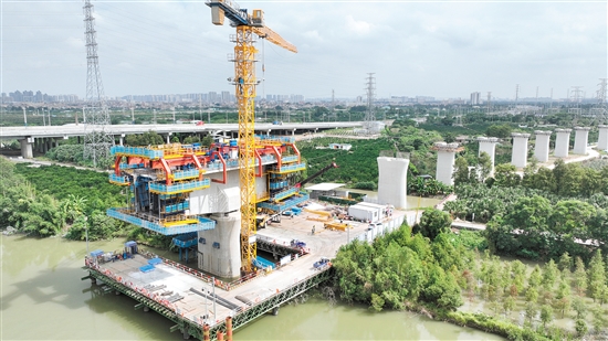 江门日报讯 (记者/胡晴晴 通讯员/李创继) 记者昨日(11月7日)从江海区住房和城乡建设局了解到,在中铁二十五局深江铁路12标施工现场,一台多功能悬臂智慧造桥机像巨型3D打印机一样正在“打印”桥梁,经过建设者历时7天的浇筑、张拉、养护等数十道工序,跨江门水道连续梁327号墩第二节连续梁顺利浇筑完成,标志着智慧造桥机在深江铁路江门段建设中首次成功运用。