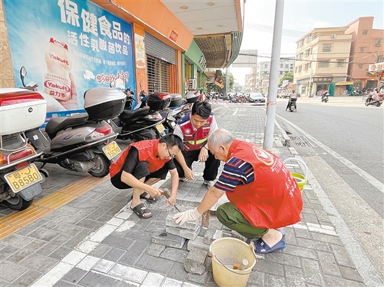 “前面商场门口路段砖块松动、缺失,坑洼不平,走路很容易摔跤!”近日,江南街道新中社区接到居民反映,某超市门前路面存在安全隐患。网格员黄展豪随即前往现场查看情况,确认问题后,迅速联合社区志愿服务队展开行动。