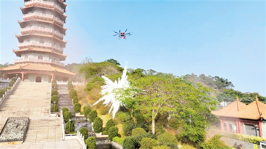 江门日报讯 (记者/陈婵) 近日,白水带风景区龙光塔东侧上空,一台无人机迎着“熊熊火焰”,精准投下一枚灭火弹,瞬间四周腾起白色雾气,火势得到有效控制。这惊心动魄的一幕,并非真实火灾,而是江海区应用无人机开展森林灭火应急实战演练的现场。