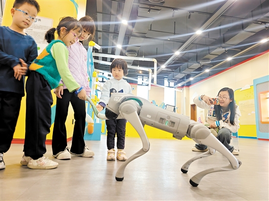 江门日报讯 (文/图 记者/郭永乐) 近日,一只身姿矫健、动作灵活的“大狗”在江海区科技馆与公众见面,只见它能根据操控者的指令,完成跟随行走、上下楼、和人握手等一系列动作,吸引了现场众多小朋友的注意力。