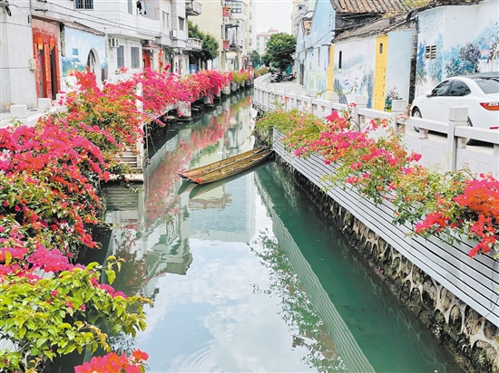 外海街道直冲村一河两岸花团锦簇,美景如画。