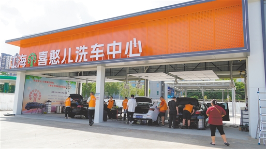 江海喜憨儿洗车中心现场,“喜憨儿”们正在工作。