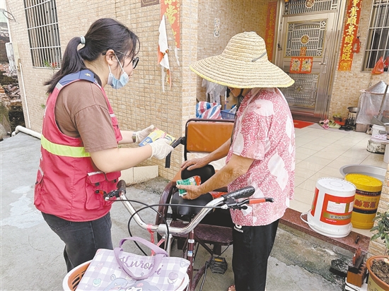 台风来临前,网格员上门宣传防蚊防台风知识,并派发灭蚊片、蚊香等。