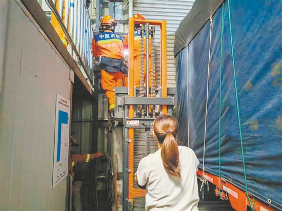 台风过境后,消防人员帮市民紧急维修变形卷帘门。