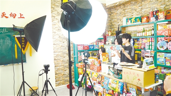 青年学子正在直播,向网友推荐江海优品。