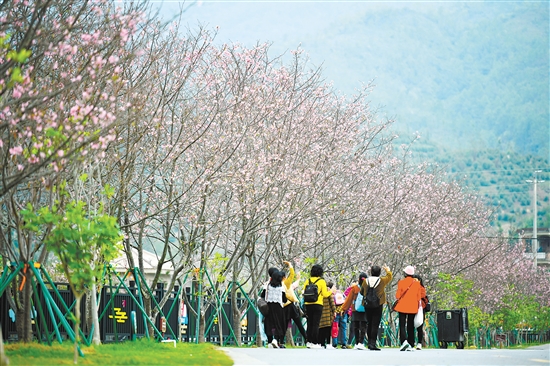 鹤城镇城西村樱花大道铺设沥青路近1.2公里,种植2200多棵樱花树,包括牡丹樱、红粉佳人樱、广州樱等13个品种的樱花。今年还种植了油菜花、玫瑰花等,增设了铁轨小火车等游乐设施,迎接八方来客。 鹤城镇供图