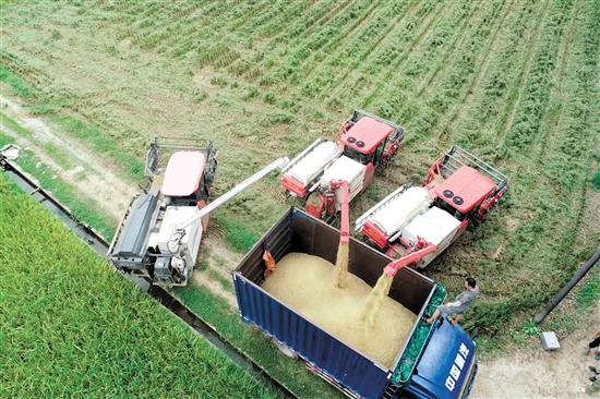 在位于鹤山市址山镇昆阳村的更鼓垌水稻高产示范片,农业技术人员驾驶着收割机,开足马力在稻田中穿梭作业,伴随着“隆隆”声,割稻、脱粒、装车一气呵成,一派繁忙劳作的景象。