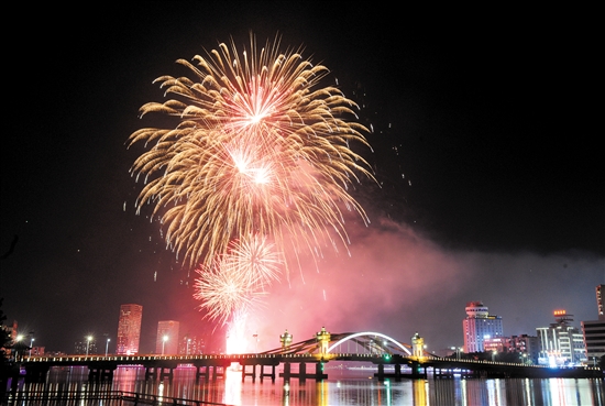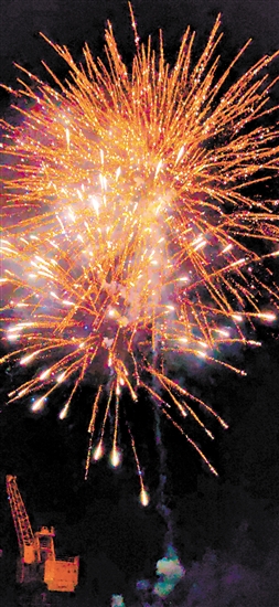 烟花在空中绽放,照亮了潭江两岸。 苏云峰 摄