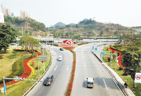 蓬江区住房城乡建设局(区交通运输局)积极推进高速沿线景观提升,推动绿美蓬江建设。图为龙湾高速出入口。