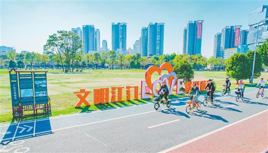 市民在西江碧道上骑行休闲。 刘淑君 摄
