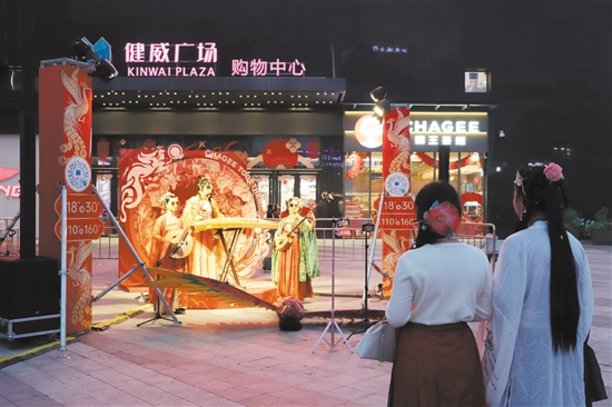 在健威广场,身穿汉服的市民驻足欣赏国潮音乐表演。