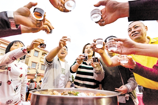 棠下镇横江东边村的村民组织晚宴、共庆春节。