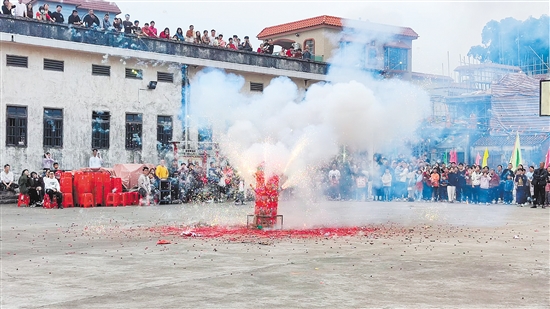 乙巳蛇年正月初四的中午时分,棠下镇横江东边村的球场上传来“嘭、嘭、嘭”的声音。只见炮圈直冲云霄,弹飞约40米高,在阵阵白烟中,前来参加传统节庆活动抢花炮的村民们铆足劲儿朝着炮圈坠落的方向奔跑,大家都渴望夺得头彩,将新一年的好运收入囊中。没有抢到炮圈的村民们也满眼笑意,和左邻右舍打招呼、唠家常,谈谈家乡的变化,等待晚宴到来,共贺新春佳节。