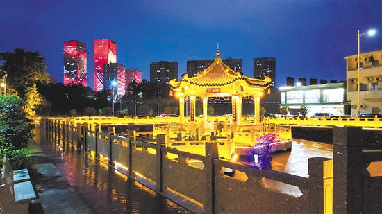 篁庄社区积极修缮活化老旧建筑,以文明实践夯实民生基础。图为“仁寿阁”亲水凉亭夜景。