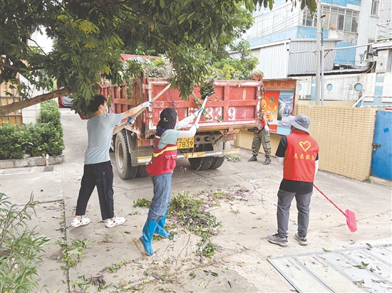 蓬江区在环市街道里村社区旧村片区开展攻坚行动。图为环境整治组工作人员清理野生绿植。任佳燕 摄