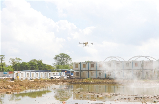 区住房城乡建设局联合辖区企业开展无人机高空全域消杀行动。图为无人机在潮连街道进行消杀。刘淑君 摄