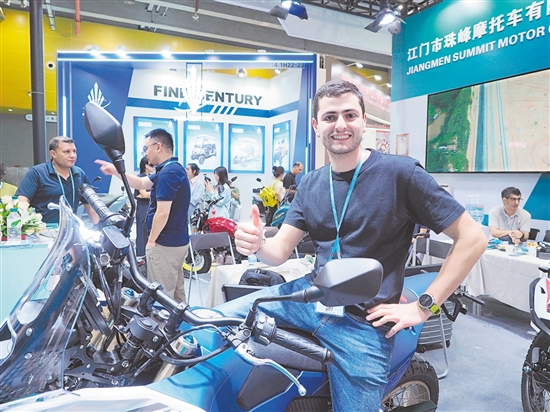 在江门市珠峰摩托车有限公司展位,外国客商前来了解摩托车新品情况,并为产品点赞。张泽彬 摄