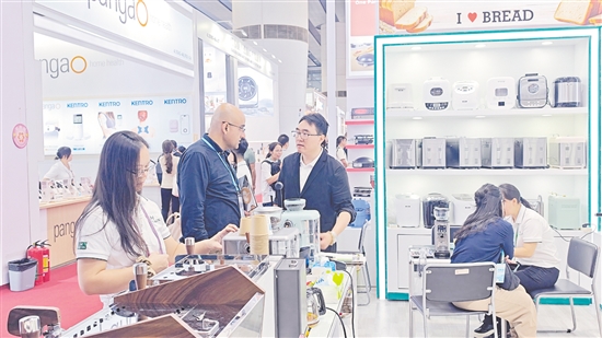外国客商在一家蓬江区家电企业的展区前洽谈合作。任佳燕 摄
