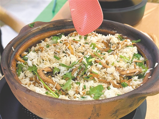 据了解,《台山黄鳝饭团体标准》对制作工艺、原材料及质量要求作出明确规定。食材准备上,严格界定黄鳝品种、大小,以及大米产地、品质;烹饪环节,从黄鳝处理、炒制火候,到米饭蒸煮时间、比例搭配等,均详细描述,确保高品质。制作须遵循“煮、炒、焗”三道核心工艺,主料选用每公斤20至32条的鲜活黄鳝与台山丝苗米,搭配姜蓉等辅料及十余种调料,还特别强调锅巴要呈金黄色、带焦香味,米饭粒粒分明、鳝肉嫩滑。