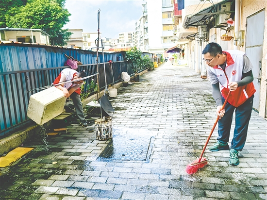 “我是党员,又是村民小组长,得带好头!”在台山市赤溪镇北门康年九村,70岁的老党员钟明星是村里活跃的防疫先锋。“先清理闲置地和巷道杂物!”来到村口,钟明星扯着洪亮的嗓子招呼村里的年轻人。话音未落,他率先走进狭窄的巷道,用手中的工具熟练地清理沟渠里的落叶杂物。钟明星和村民们分工协作,有的倒积水,有的整理空桶。完成这里的工作后,他又匆匆赶往下一处排查点。