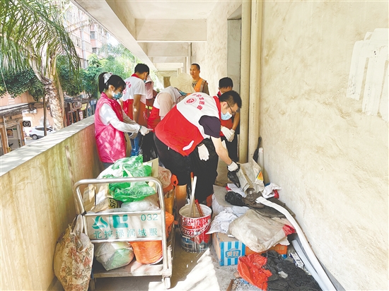 会城街道明兴社区联合结对单位志愿者,对无主车房内的废品进行全面清理。