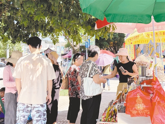 “帅哥美女,尝尝我们的陈皮花生。”“陈皮绿豆沙清热消暑,来一碗吧!”“你们这朵陈皮玫瑰花怎么做的?好别致。”沿着茶坑村陈皮商业街闲逛,村道古色古香的韵味与现代商业气息融合得恰到好处。这里汇聚了多家店铺,涵盖柑普茶、小青柑、葵扇等本地特色产品,商贩与顾客之间的互动有来有回,在谈笑间便促成了一单又一单小买卖。