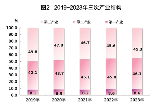 根据广东省地区生产总值统一核算结果,2023年江门实现地区生产总值(初步核算数)4022.25亿元,比上年增长5.5%。其中,第一产业增加值347.01亿元,增长5.9%;第二产业增加值1855.14亿元,增长7.3%;第三产业增加值1820.10亿元,增长3.6%。三次产业结构比重为8.6∶46.1∶45.3,第二产业比重提高0.3个百分点。人均地区生产总值83409元(按年平均汇率折算为11837美元),增长5.6%。