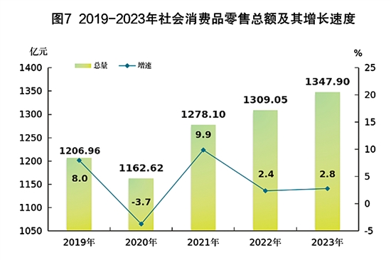 全年全市社会消费品零售总额1347.90亿元,比上年增长2.8%。按经营地统计,城镇消费品零售额1043.27亿元,增长2.6%;乡村消费品零售额304.63亿元,增长4.4%。从消费形态看,商品零售1213.11亿元,增长1.7%;餐饮收入134.79亿元,增长15.7%。