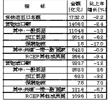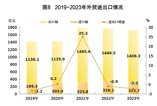 全年全市货物进出口总额1732.0亿元,比上年下降2.2%。其中,进口323.7亿元,下降1.2%;出口1408.3亿元,下降2.4%。对共建“一带一路”国家进出口674.1亿元,下降1.9%。对RCEP其他成员国进出口378.0亿元,下降3.8%。