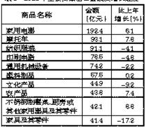 在限额以上批发和零售业商品零售额中,电子出版物及音像制品类增长50.3%,通信器材类增长47.5%,日用品类增长4.6%,书报杂志类增长4.0%,石油及制品类下降0.1%,中西药品类下降1.7%,汽车类下降7.5%,粮油、食品、饮料、烟酒类下降7.9%,体育、娱乐用品类下降9.7%,服装、鞋帽、针纺织品类下降10.9%,金银珠宝类下降12.1%,文化办公用品类下降12.1%,家用电器和音像器材类下降16.7%,建筑及装潢材料类下降18.6%,化妆品类下降66.2%。全年限额以上单位通过公共网络实现的商品零售额44.87亿元,占限额以上单位商品零售额的10.2%。