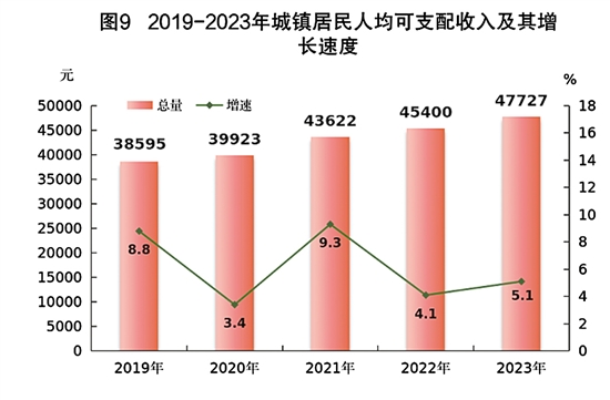 全年城镇居民人均可支配收入47727元,比上年增长5.1%。其中,工资性收入33647元,占全部可支配收入的70.5%。