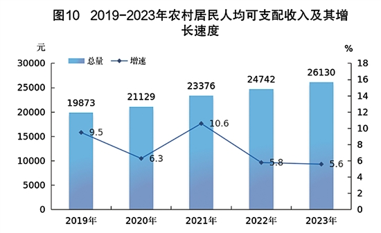 全年农村居民人均可支配收入26130元,比上年增长5.6%。其中,工资性收入19233元,占全部可支配收入的73.6%。