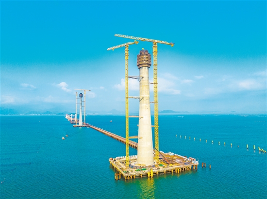 黄茅海畔,迎风而立,长达10多公里的施工栈道,从岸边直抵大海中央,横卧碧波之上,另一个“超级工程”黄茅海跨海通道也正勇攀高峰。“黄茅海跨海通道的最大控制性工程黄茅海大桥,是未来世界最大跨径三塔公路斜拉桥,如今大桥主墩如‘定海神针’般深扎海中,‘成长’中的主塔节节攀高,‘身高’超百米。”黄茅海跨海通道T5标项目副经理高骏表示,黄茅海大桥主塔为独柱纤腰型,如广州经典建筑“小蛮腰”,立于大海之上,其中主塔最高达263米,建成后既壮观也美丽,将成为大湾区新地标。