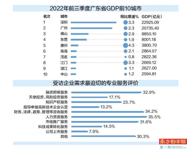 报告分析了2022年上半年、前三季度、前10个月,江门主要经济指标的总量和增速,并与广东经济排名靠前城市进行了比较。其中,今年前三季度GDP增速,江门与深圳并列全省第二。