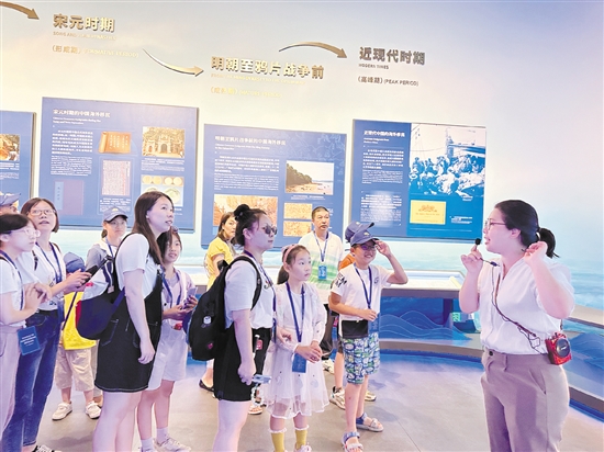“你们看展厅是蓝色的,这就象征着中国侨都江门走出去依靠的是海洋。”7月22日,在侨博馆内,讲解员生动地为游客讲解着“远赴重洋”“拼搏海外”“融通中外”等侨胞历史。侨博馆展示了波澜壮阔的江门籍华侨华人史迹,让游客更加了解当年江门籍华侨华人漂洋过海不辞艰辛、艰难创业的精神和忠心报国的壮举。
